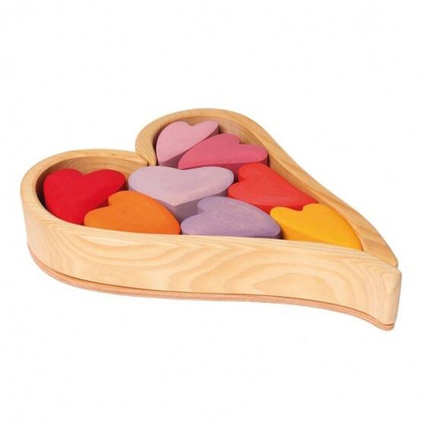 Deze blokkenset bestaat uit 10 hartjes in vrolijke regenboogkleuren met een opbergdoosje in de vorm van een hartje dat bestaat uit 3 lossen delen. Gebruik het opbergdoosje in het bouwspel en bouw de mooiste stapels. Doordat het hout niet gelakt is kunnen de blokken op elkaar gestapeld worden zonder dat ze van elkaar glijden en voelen ze heerlijk aan.