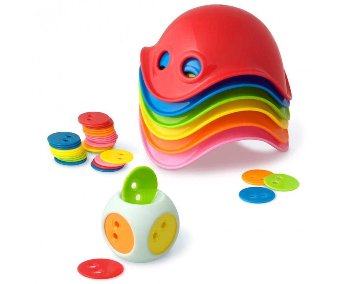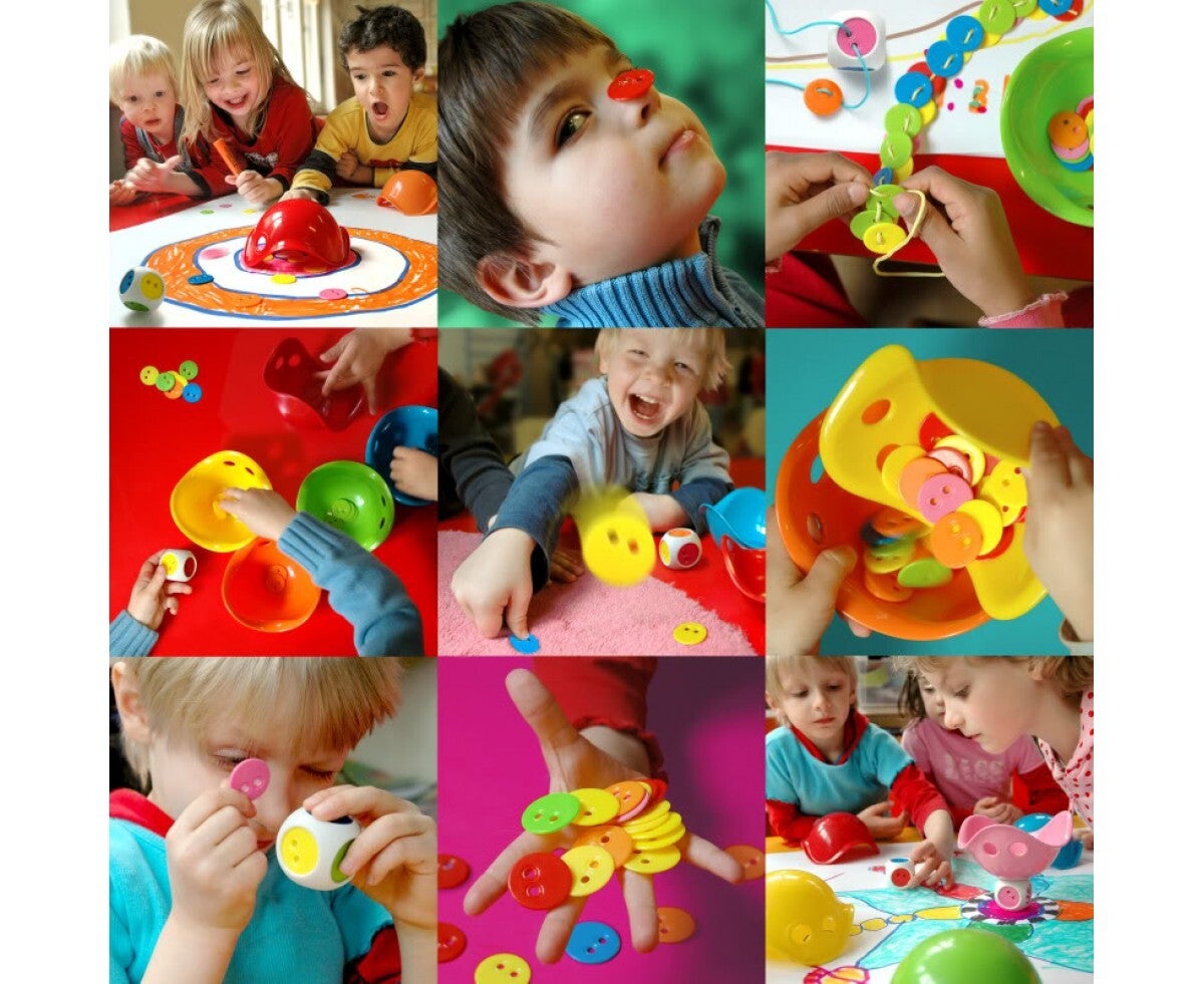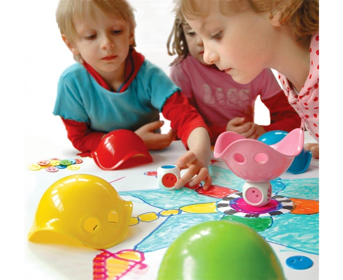 Bestaat uit 6 kleine, mini bilibo's, 1 dobbelsteen, 36 gekleurde plaatjes, opbergzak en een boekje met uitleg.
