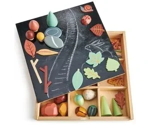 Deze mooie houten sorteerdoos boordevol kleine schatten die zo uit het bos lijken te komen staat garant voor urenlang open ended speelplezier. Het deksel kan gebruikt worden als krijtbordje en als bodem om een mooi bostafereel te creëeren met de spulletjes uit de doos en zelfgevonden kostbaarheden. De houten onderverdelingen in de box kan je wegnemen en je kan de bak bijvoorbeeld vullen met zand voor extra sensorisch speelplezier.