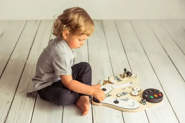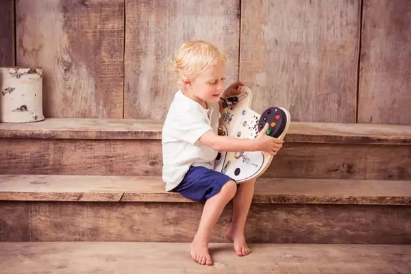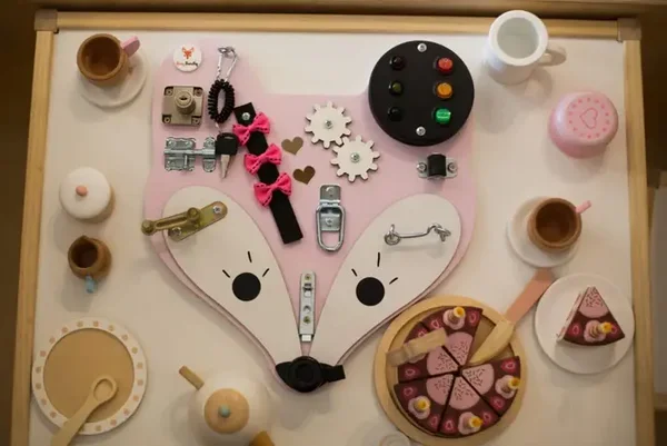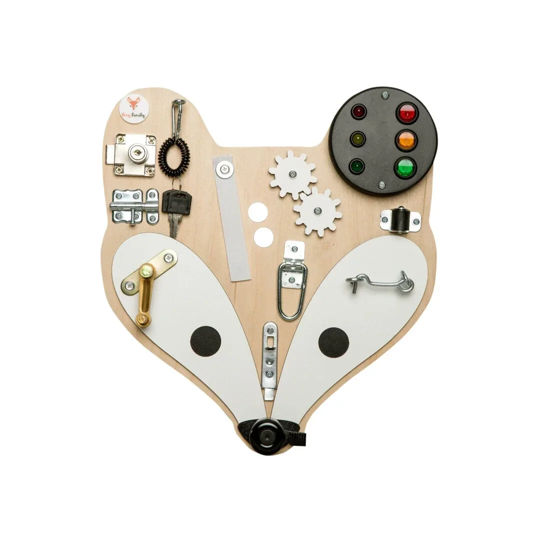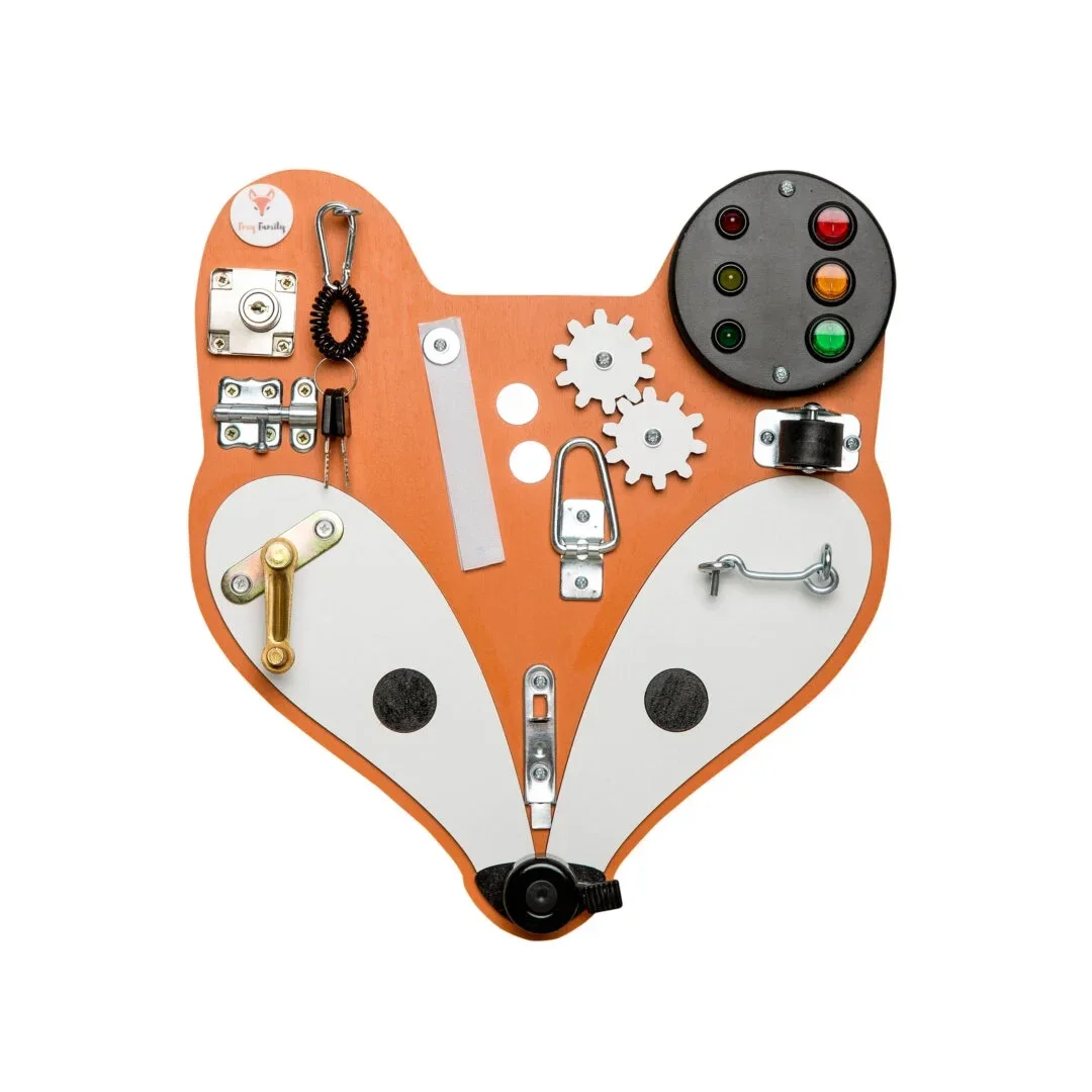 Het activiteitenpaneel "Fox Head" van Foxy Family, ontworpen voor kleine kinderen, die niet lang gefocust kunnen worden gehouden door gewoon speelgoed. Dit paneel wekt en houdt de nieuwsgierigheid van kinderen vast dankzij de structuur vol interessante elementen.
