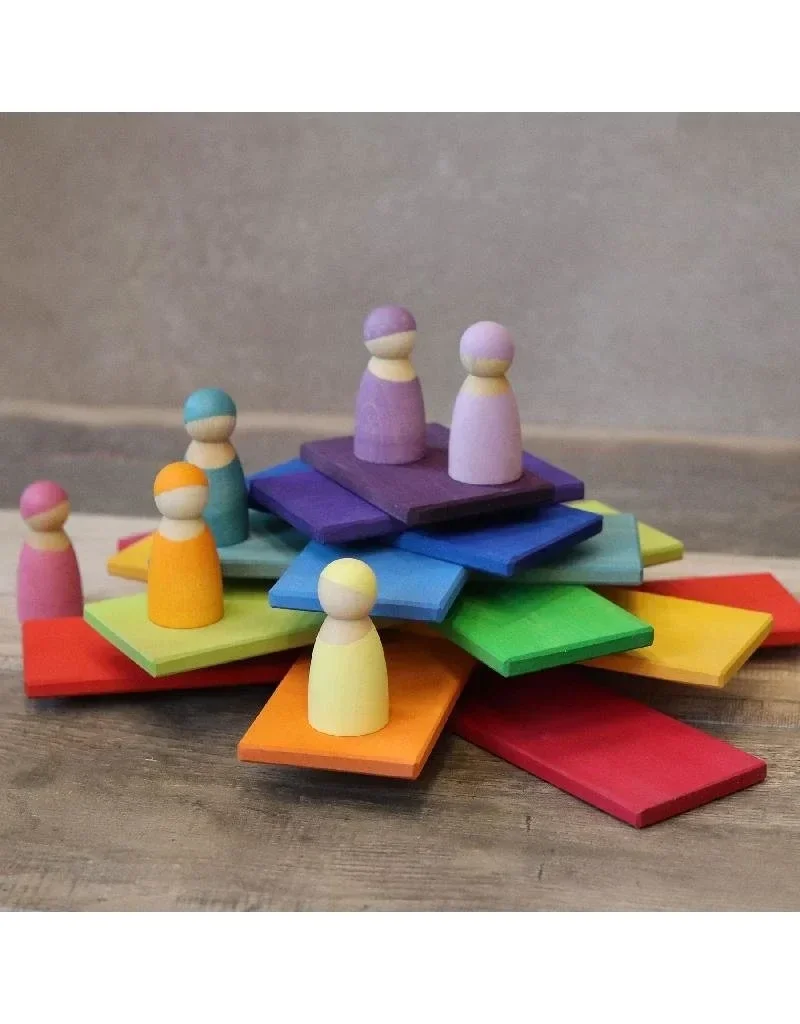 Mooie 11-Delige houten bouwplanken/bouwplaten van Grimms in regenboogkleuren. De langste plank heeft een lengte van 37 cm en ze hebben allemaal een breedte van 7 cm en een dikte van 8 mm. De bouwplanken kunnen gebruikt worden om de bekende houten regenboog en de halve cirkels aan te vullen.