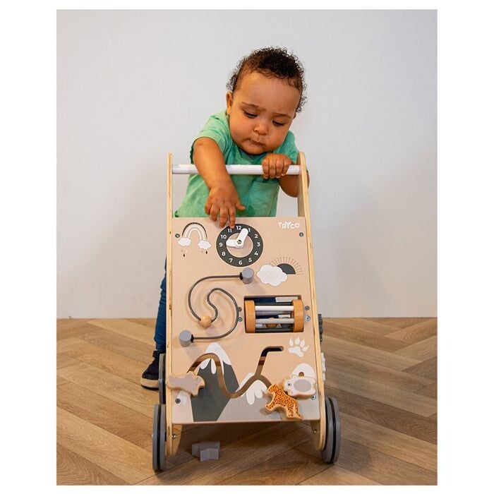 De houten loopwagen met activiteiten van Tryco is niet zomaar een loopwagen; het is een veelzijdig speelmaatje dat je kleintje uitnodigt om de wereld van beweging en ontdekking te verkennen. Speciaal ontworpen voor kinderen vanaf 12 maanden die hun eerste stapjes zetten, biedt deze loopwagen een combinatie van leuke en leerzame activiteiten die de motoriek en zintuiglijke vaardigheden van je kindje op een speelse manier ontwikkelen. Zo vindt je aan de voorkant van de loopwagen een vrolijk klokje met draaiende wijzers, een boeiende kralenspiraal, een rammelaar voor auditieve stimulatie, en schuifblokjes in de vorm van schattige diertjes. De ene zijkant is voorzien van een uitdagende vormenstoof met twee losse blokjes om de nieuwsgierigheid van je kleintje te prikkelen. Aan de andere kant zijn draaiende tandwielen te vinden, wat voor extra interactief plezier zorgt.
