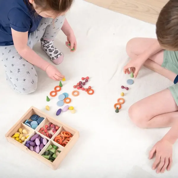 Ontworpen om een open benadering aan te moedigen, creativiteit te ontdekken, hand-oogcoördinatie en fijne motoriek te ontwikkelen. De objecten kunnen worden gebruikt voor spelen in kleine werelden, sorteren, stapelen of patronen maken. Inclusief blauwe stenen, rode knevels, oranje ringen, gele druppels, paarse augurken en groene kegels.