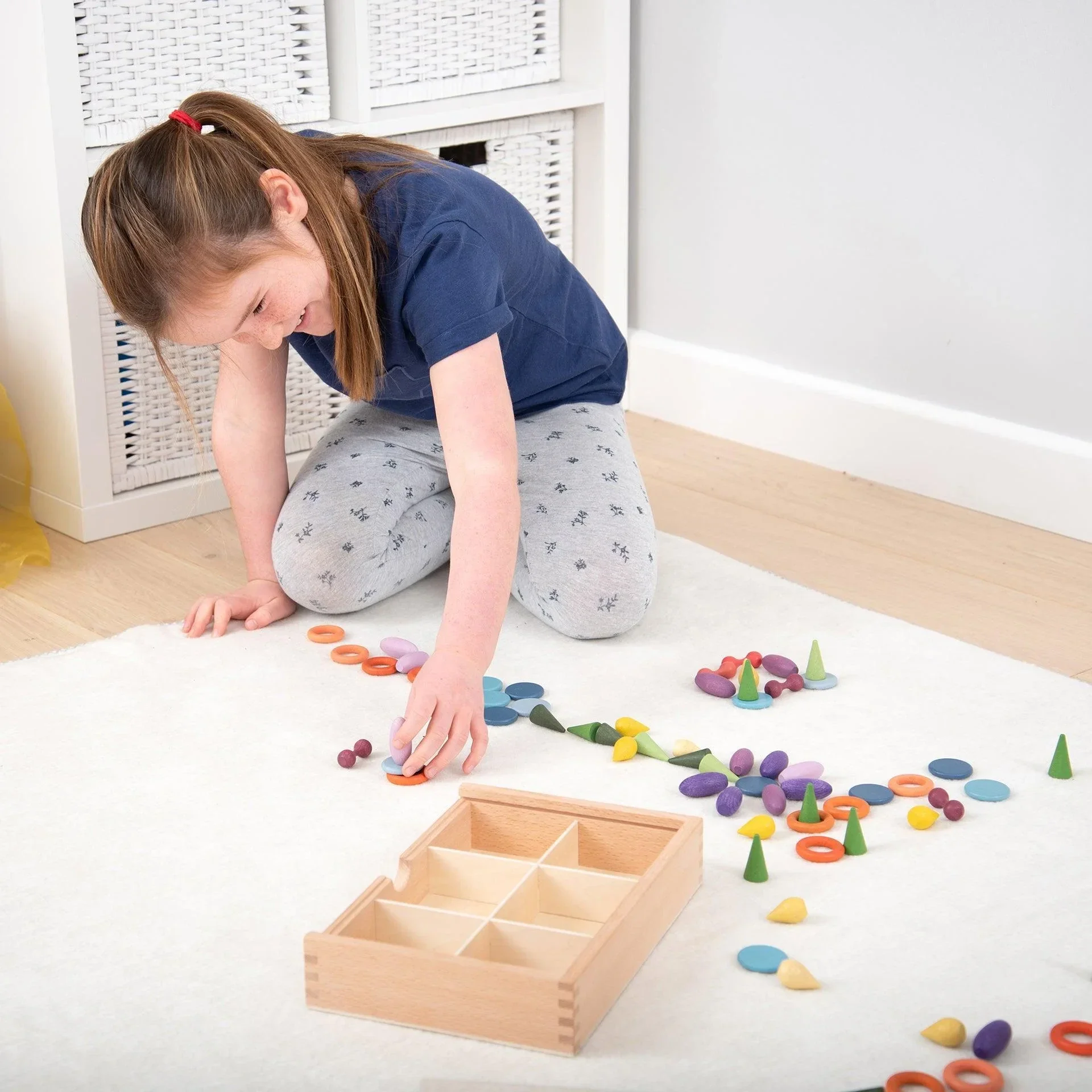 Set bevat: 108 schatten (18 van elk van de 6 vormen) en een houten sorteerbakje met 6 vakken en een schuifdeksel van helder acryl voor draagbare opslag.