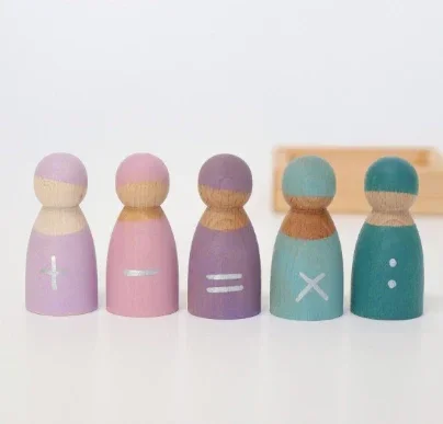 Elke rekenvriend is versierd met een rekensymbool: optellen, aftrekken, vermenigvuldigen en delen. De vijfde rekenvriend is versierd met het gelijkteken en verheugt zich op spelenderwijs begrijpelijke antwoorden.