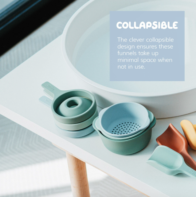 Geef je kleintje het perfecte gereedschap voor eindeloze uren zintuiglijke verkenning met de Inspire My Play Silicone Sensory Funnels - een prachtige set van 3 opvouwbare trechters.