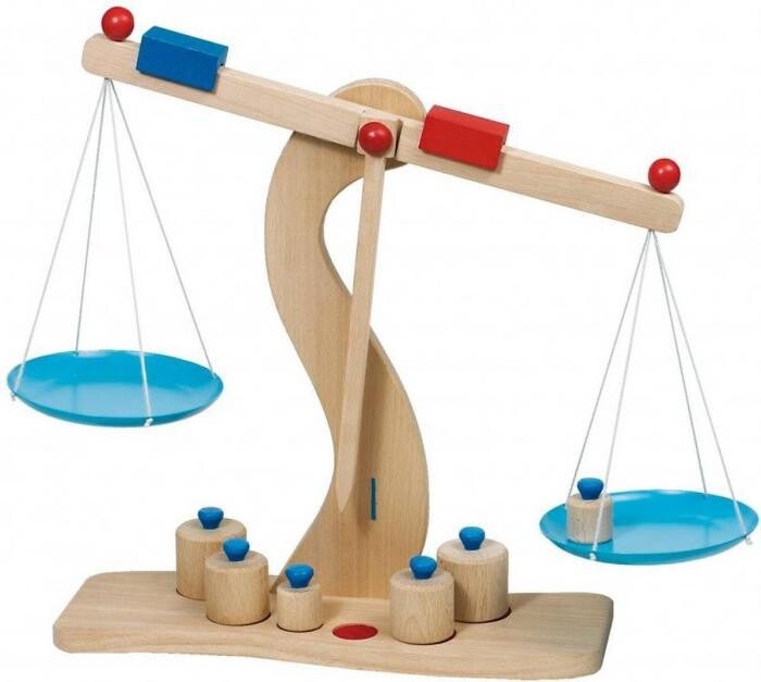 Mooie houten weegschaal met metalen bordjes en 6 gewichten om mee te spelen.