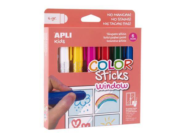 Plakkaatverf in pastel kleuren als massieve stift vorm. Geleverd in de kleuren wit, geel, roze, rood, groen en blauw. Ideaal om te tekenen en te schilderen op glas of spiegel. Verf uit de APLI Kids Color Sticks droogt snel, in minder dan 3 minuten, scherpe, levendige en intense kleuren en is gemakkelijk schoon te maken met een vochtige doek.