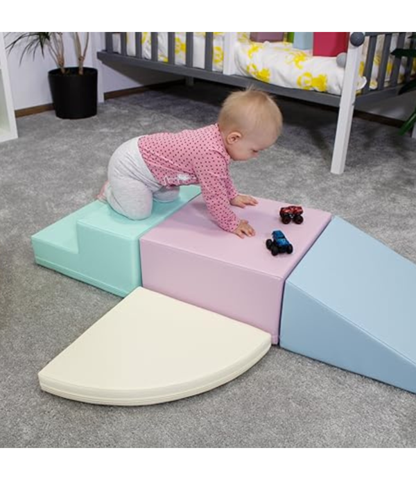 De zachte blokken stimuleren het kruipen, klimmen en de grove motoriek – essentieel voor balans, coördinatie en spierontwikkeling. Zo ontdekken kinderen hun omgeving veilig en spelenderwijs.