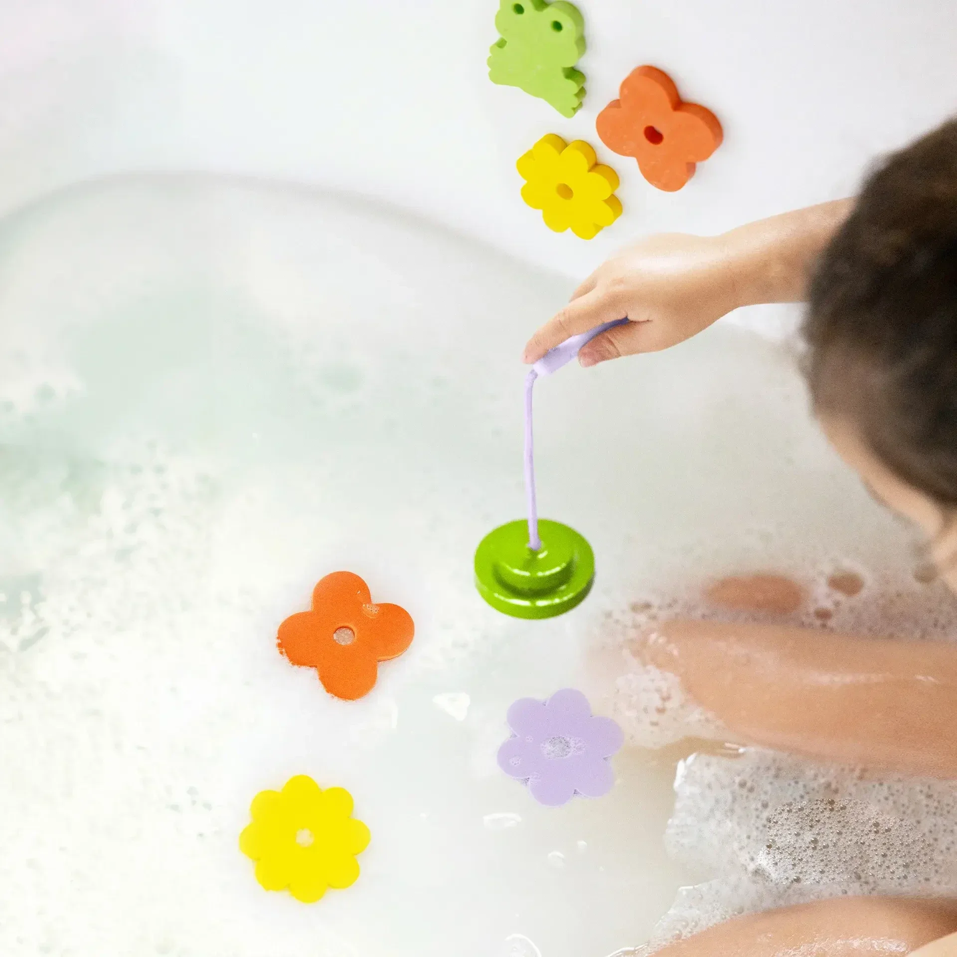 Vanaf 10 maanden spelen kinderen met drijvende schuimblokjes die aan de badkuipmuren blijven plakken. Op 18 maanden vissen ze met de meegeleverde hengel – geen magneten nodig! Deze vormen blijven drijven op het water, wat de verbeelding stimuleert en de coördinatie verbetert.