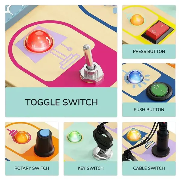 Met de Busy Board lichtschakelaar leren kinderen van 36 maanden en ouder net als volwassenen verschillende schakelaars uit hun dagelijks leven te gebruiken.