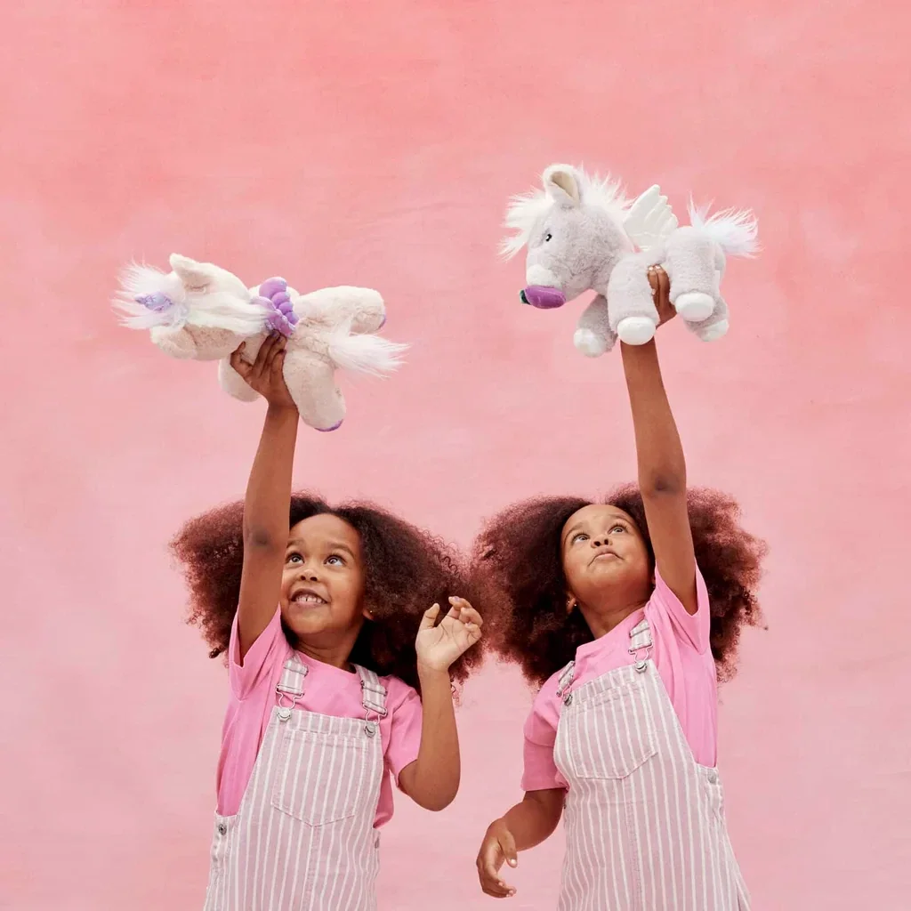 De volledig poseerbare Glimmer heeft een magnetische mond waarmee ze haar fluwelen wortel of baby eenhoorn sidekick kan dragen, voor extra speelmogelijkheden. Haar iriserende vleugels en hoeven, fluwelen oren en onweerstaanbare zachtheid maken haar niet alleen een prachtig speelgoed, maar ook een perfecte knuffelvriend.