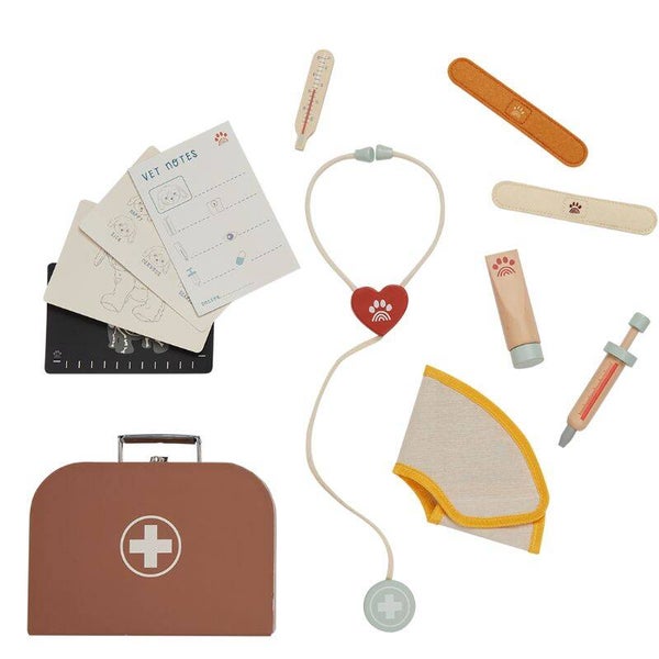- Inhoud: Kartonnen draagkoffer met magnetische houten thermometer, stethoscoop, spuit, zalfbuisje, vilten verbanden, busterkraag, patiëntenkaarten en medisch notitieblok.