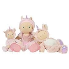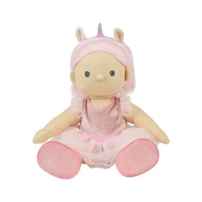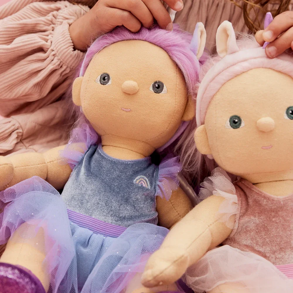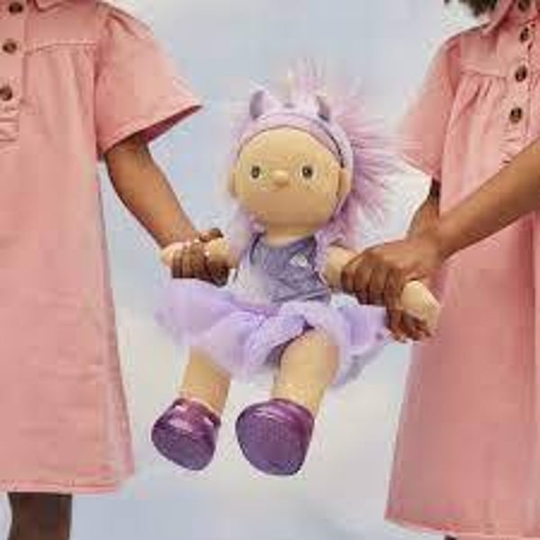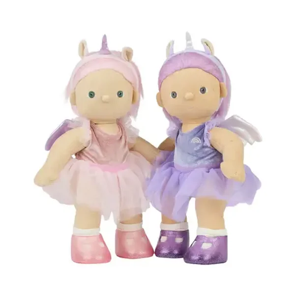 Dream Dinkum Doll Violet brings a little one's world of magic and dreams to life. Made from soft fabric and sporting an outfit designed with shimmering details, Violet is always ready for adventures filled with wonder. Dressed in a velvet leotard with a glittery tulle tutu, plush iridescent wings, and a sparkling unicorn headband, Violet is made for flights of fancy and sweet snuggles alike.