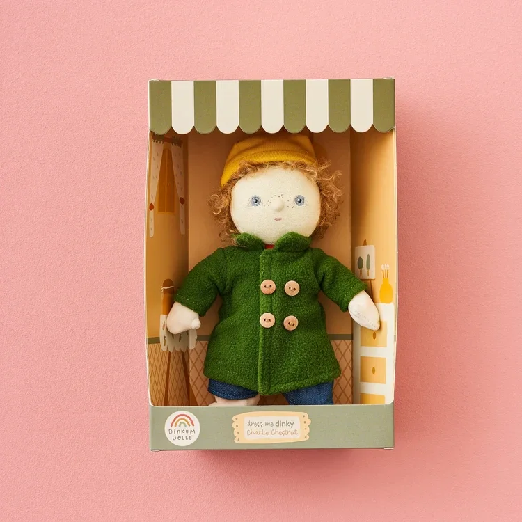 Gekleed in een dichtgeknoopte groene trenchcoat en met een vrolijke gele muts is Charlie Chestnut klaar om in een wereld vol fantasie te duiken! Zal hij een parade van Dinky's door de jungle van de woonkamer leiden, op zoek gaan naar verborgen schatten onder de kussens of zijn volgende grote escapade in de tuin bedenken? Charlie maakt van elke dag een kans op grote avonturen. Dress Me Dinky's zijn de plek waar verhalen beginnen en herinneringen worden gemaakt, outfit voor outfit. Charlie's kleine garderobe zit vol grote dromen.