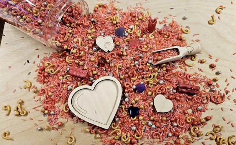 De kikkererwten en Pasta worden geverfd met niet giftige acrylverf. De speelrijst word gekleurd met azijn en voedselkleurstof.