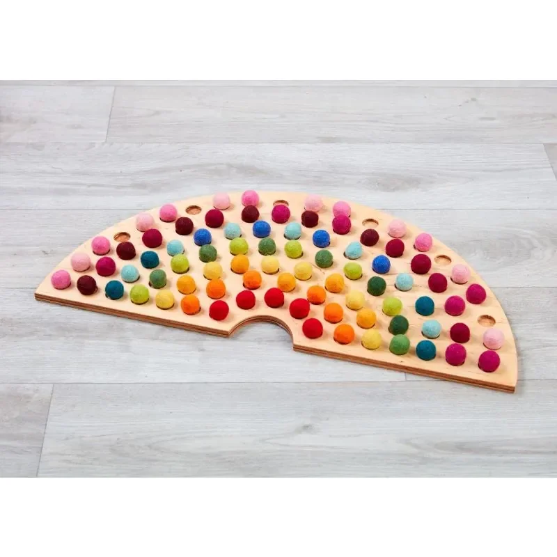 Ready to paint the world with a rainbow, no crayons required? Our Felt Ball Rainbow Maker is here to make colour play an enchanting experience. With a sturdy wooden board featuring indents to display all seven vibrant colours, it invites endless opportunities for creativity, fine motor skill development, and imaginative exploration.