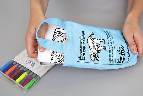 Deze stoffen placemat zit in een mooi opbergtasje dat je eenvoudig meeneemt als je naar een restaurant gaat. De placemat is in te kleuren met de meegeleverde stiften en na gebruik eenvoudig weer uit te wassen.
