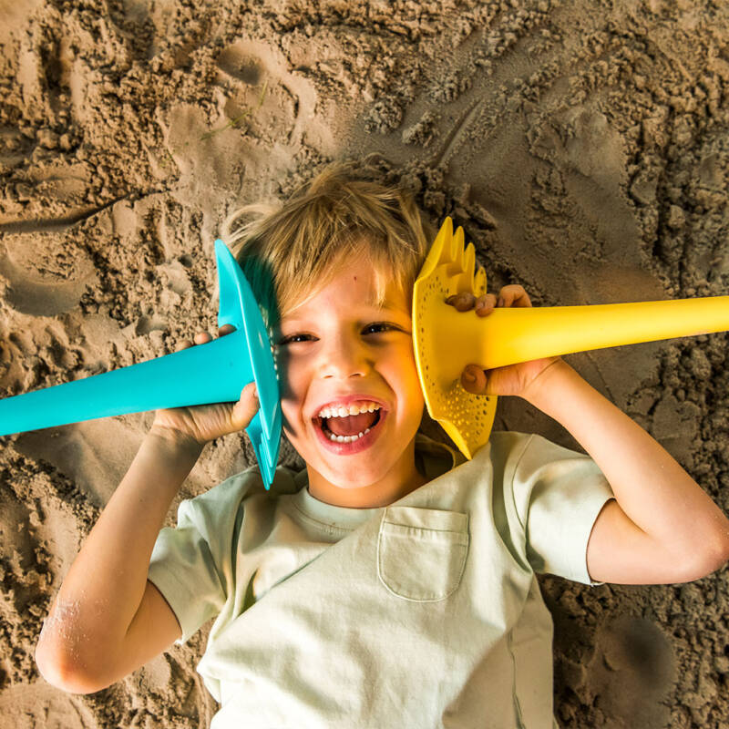 Gebruik Triplet als schopje om gaten te graven, om funderingen te bouwen en grachten uit te snijden. Gebruik het als zeef, om schelpen en andere zaken uit het zand te filteren voor glad, vormbaar zand. Of gebruik Triplet als hark, om extra figuren te maken. De holle handgreep kan zelfs worden gebruikt als watertrechter om de coolste zandkastelen ooit artistiek af te werken!