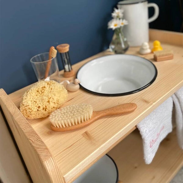 Met deze leuke montessori wastafel kunnen jonge kinderen al snel leren om zelf hun te handen wassen, tanden te poetsen of zelfs de afwas doen! De meegeleverde emaille waskom kan worden verwijderd, zodat het makkelijk schoongemaakt kan worden. De wastafel is ruim genoeg voor een kan of beker water, een tandenborstel, etc. De wastafel is voorzien van een handige stang waar je eenvoudig een handdoek aan kunt ophangen. Op het onderste plankje kan een emmer of bijv. toiletartikelen worden geplaatst, zodat alles overzichtelijk en binnen handbereik is.