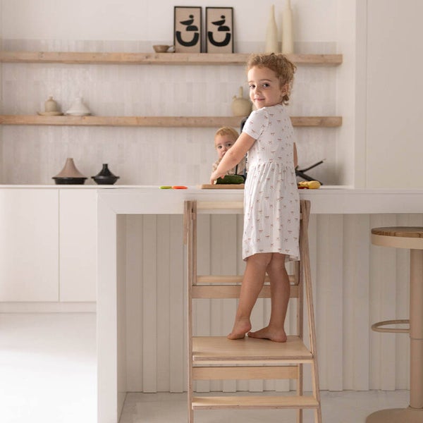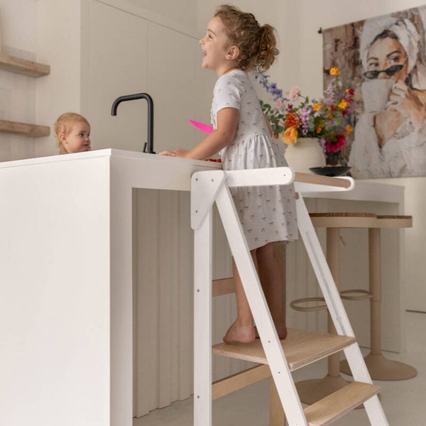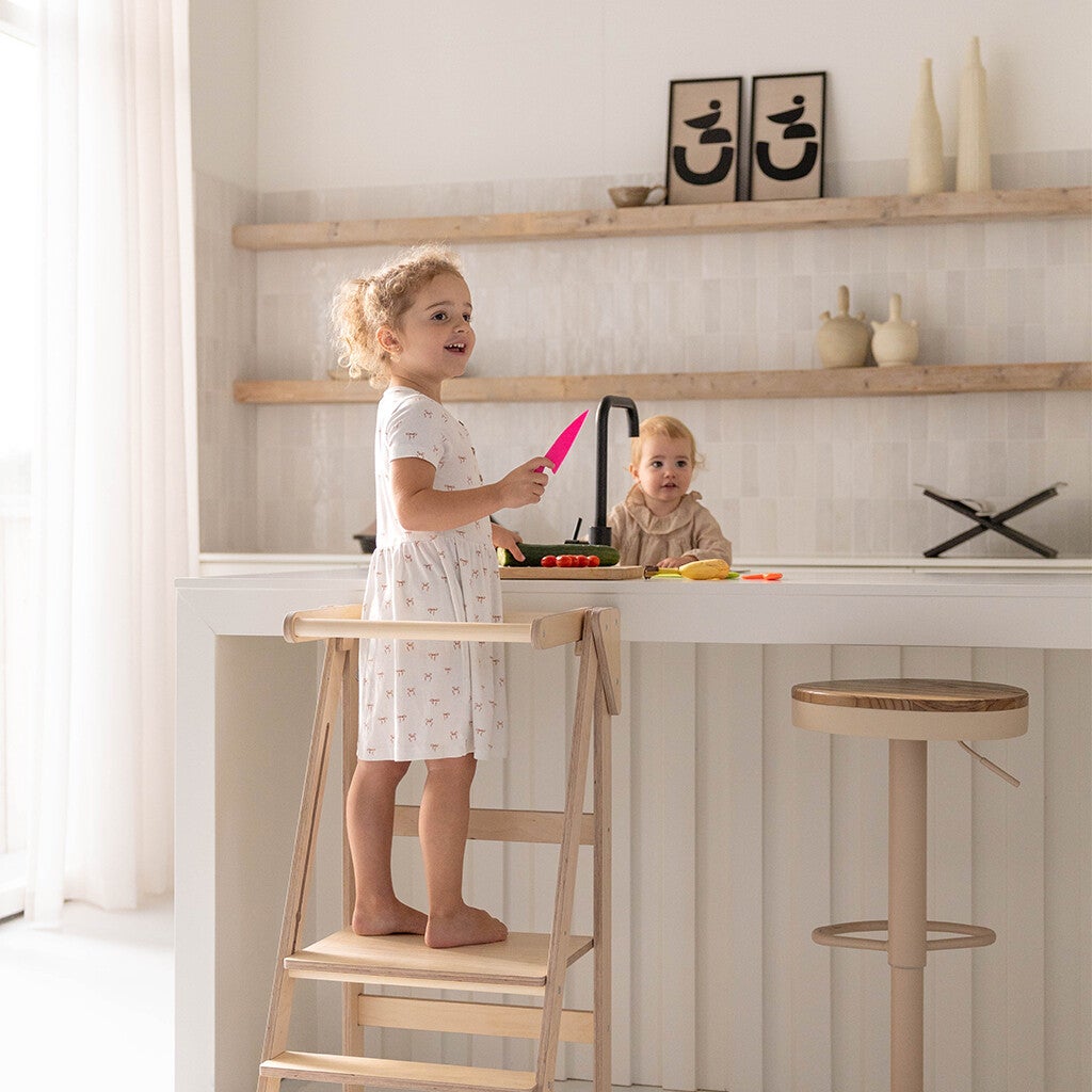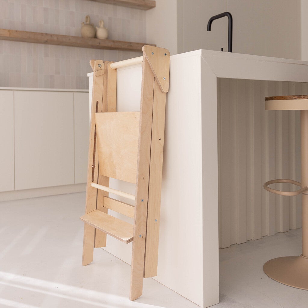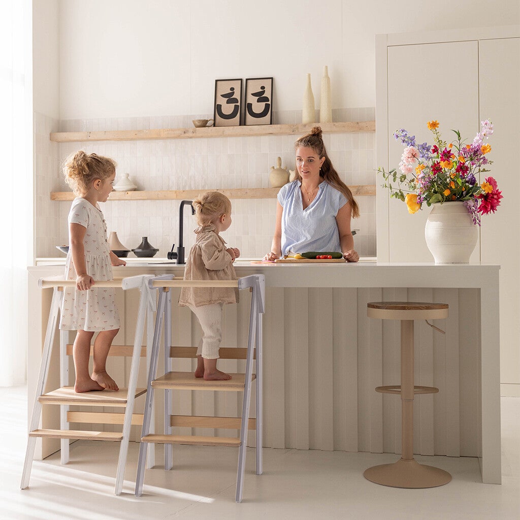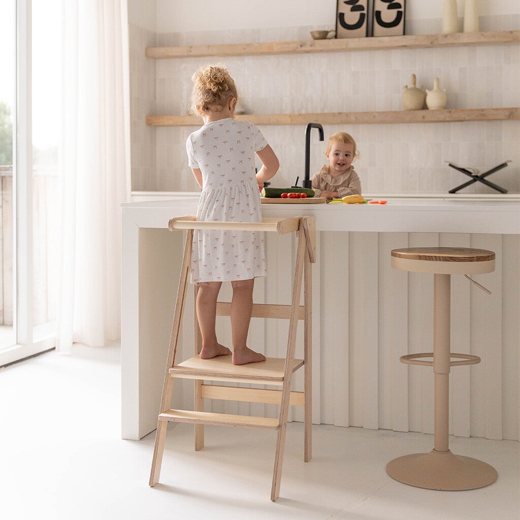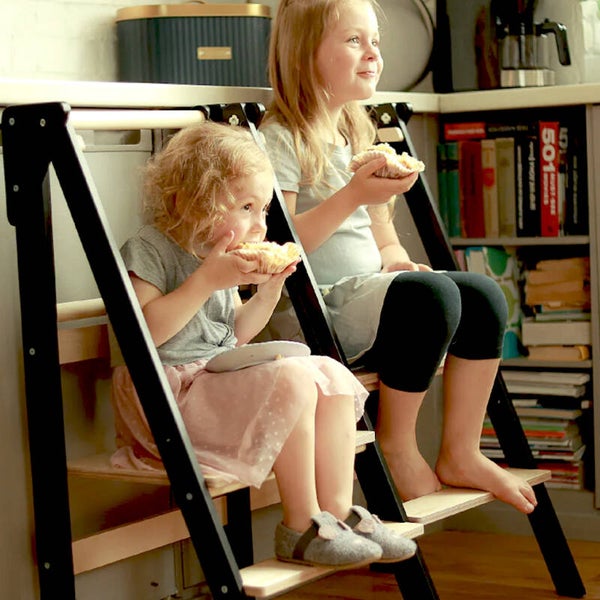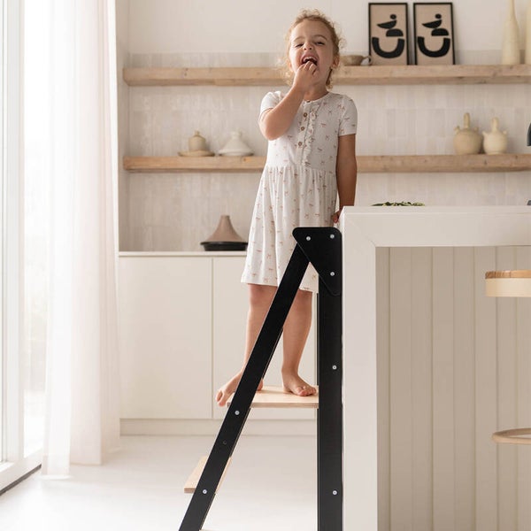 Deze inklapbare leertoren van Jindl in houtkleur met stijlvolle zwarte elementen is super handig! Uitstekend geschikt voor kinderen die al zeer stabiel zelf kunnen staan. Daarnaast is deze leertoren ook perfect te gebruiken als stoel. Op het vlak waar ze staan om bij bijvoorbeeld het aanrecht te kunnen, kunnen kinderen namelijk ook zitten. Zo schuif je de leertoren ook eenvoudig bij een tafel.
