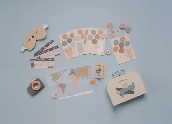 Ideale reiskoffer voor onderweg. Alles zit er in, voor een lange of een korte reis. Denk aan je paspoort, een ticket en een fotocamera om je trip vast te leggen. Ben je lang onderweg, dan komt het oogmasker goed van pas om even te dutten. Op de kaart kun je zien waar je bent of naartoe gaat en als de verveling toeslaat, dan is er een vrolijk ballonspel om met je vrienden te spelen. Goede reis!