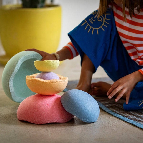 - 7 Stapelstenen in Classic Rainbow kleuren – vrolijke en felle kleuren die de fantasie prikkelen.