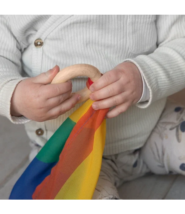 Deze houten ring van beukenhout met een speeldoek er stevig aan vastgeknoopt is fantastisch voor de jongste kinderen om kennis te maken met speeldoeken. Kinderen kunnen de houten ring gemakkelijk vastpakken.