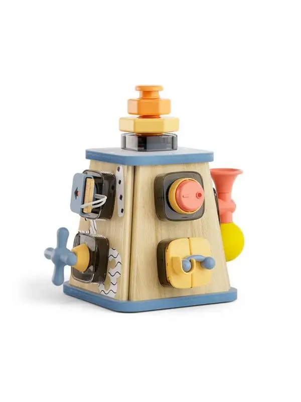 De Busy Tower is een educatieve speeltoren die kinderen van 18 maanden tot 4 jaar uitnodigt om te draaien, schuiven, voelen en kijken. De toren bestaat uit verschillende interactieve zijden, elk met hun eigen uitdaging. Terwijl je kind vol verwondering ontdekt hoe beweging werkt, bouwt het tegelijkertijd aan zijn fijne motoriek, probleemoplossend denken en focus. Een aanrader voor kinderen die graag zelfstandig spelen, maar ook samen willen ontdekken.