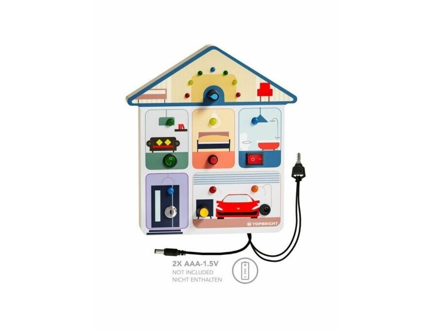 Door het omzetten van de sleutel komt dit activiteitenbord echt tot leven, wat zorgt voor genoeg vermaak voor je kindje. Er zijn meerdere knoppen en schakelaars die omgezet kunnen worden en er kunnen ook allerlei lampjes aan en uit. Het activiteitenbord is geschikt vanaf 3 jaar en ontwikkelt de motoriek van de kindjes. Het activiteitenbord werkt op 3x AAA batterijen, deze zijn niet inbegrepen.