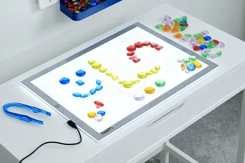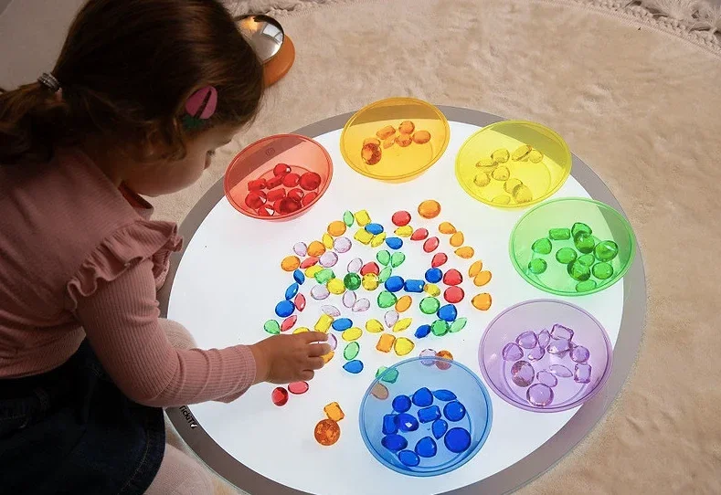 De doorschijnende eigenschappen maken ze ideaal voor gebruik met een lichtpaneel om de verbeelding van je kind te prikkelen en kleuren en de voelbare markeringen op elke vorm te verkennen.