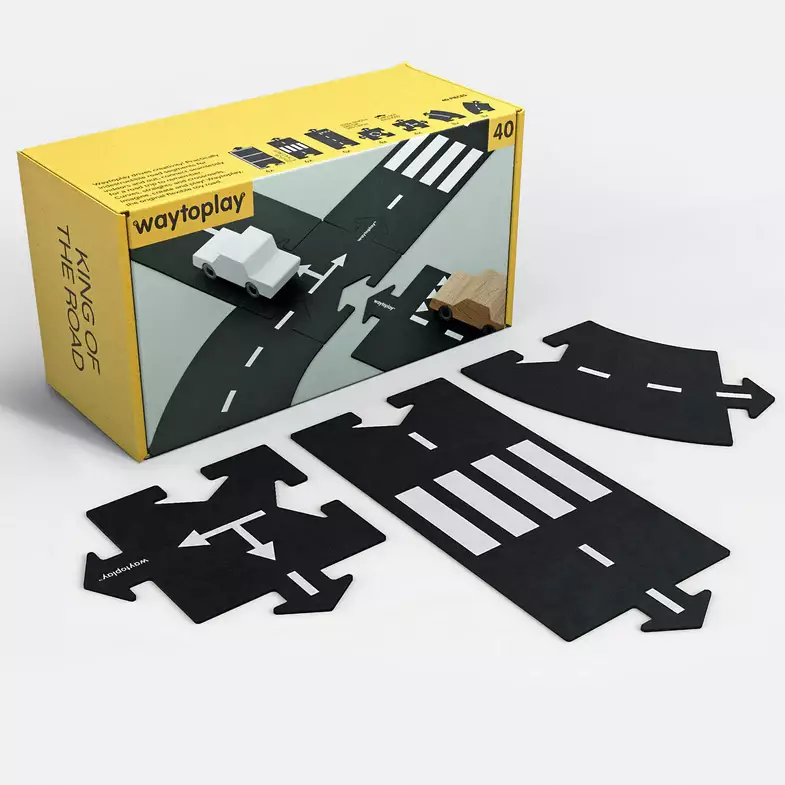 De flexibele autobaan King of the Road van het innovatieve merk WaytoPlay is fantastisch speelgoed voor elk kind dat dol is op auto's. De autobaan bestaat uit verschillende rubberen puzzelstukken die gemakkelijk in elkaar te passen zijn. Ze zijn langs 2 kanten bedrukt, zodat je keer op keer een nieuwe route kan maken! De rubberen baanonderdelen zijn stevig en flexibel waardoor je ze op alle soorten ondergronden kan gebruiken. In de sneeuw, op heet zand, in het gras, ... zelfs over een drempel kan je de autobaan gemakkelijk leggen! WaytoPlay past zich aan elke ondergrond of omgeving aan. Verder kan je WaytoPlay perfect combineren met ander speelgoed, zoals houten blokken, auto's, ... Het prikkelt de fantasie en is leerzaam, veelzijdig speelgoed. ook verkeersregels kunnen spelenderwijs aangeleerd worden.