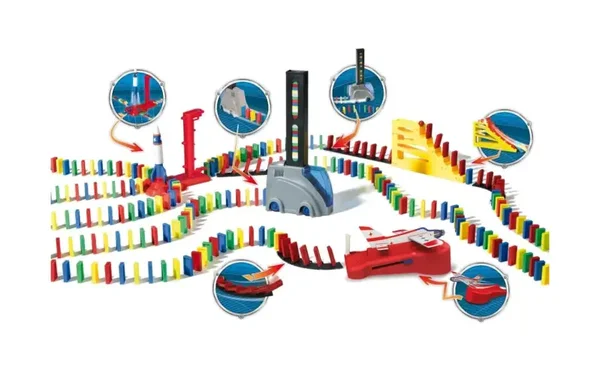 Bijgeleverd in deze set zijn ook een raket en een vliegtuig. Plaats ze aan het einde van het parcour en laat ze lanceren als het het laatste steentje omvalt.
