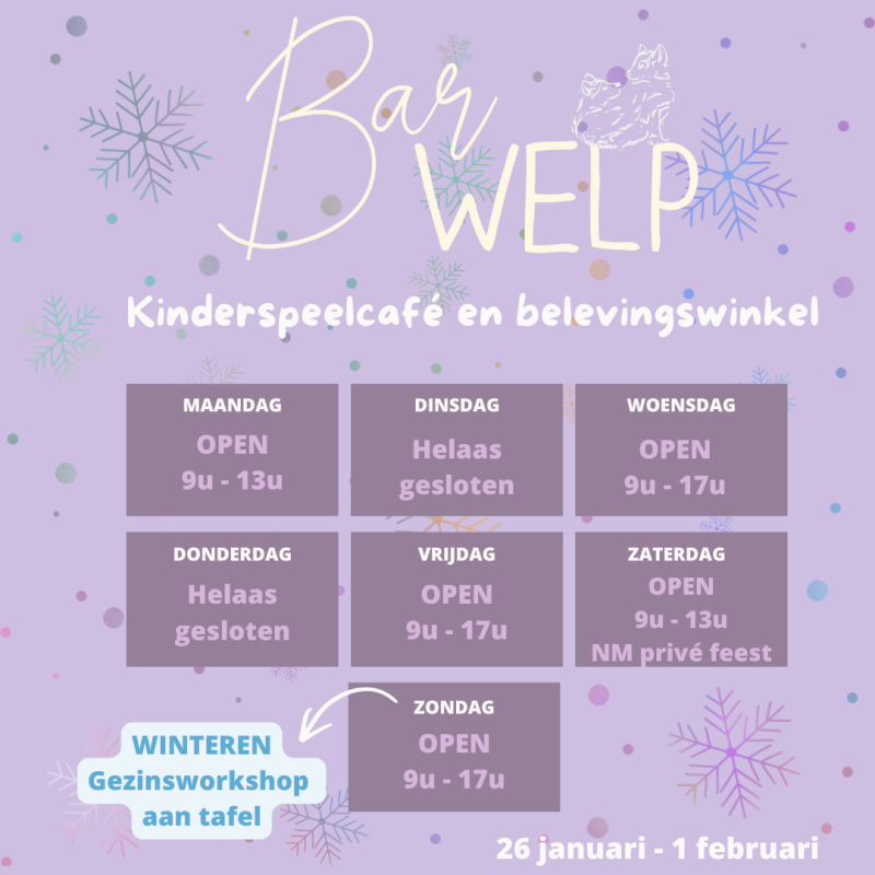 De winkel is steeds geopend gelijk met de speelagenda's, winkelen en een online bestelling afhalen kan ook na afspraak (info@barwelp.be / Whatsapp bericht: 0471728059.